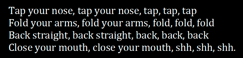 We also have “Everybody have a seat”, which we can use to go from the chairs to the carpet. If we change the word we can use the same rhyme for the opposite process: